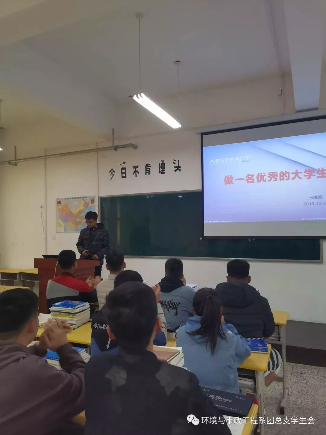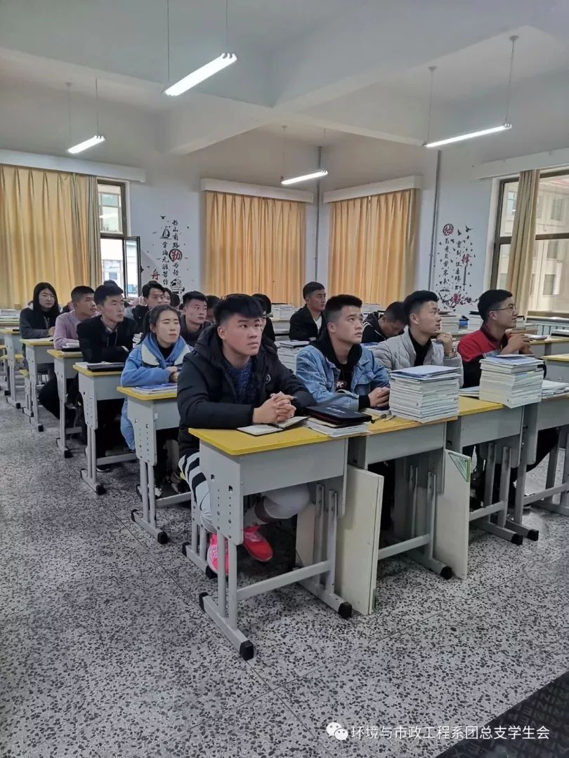 2019年10月31日下午,19级环境与市政工程系团总支、学生会全体干部以及各班团支部书记、组织委员、宣传委员等40多人在设备4-8教室开展了关于“如何做一名优秀的大学生”主题团课,本次团课由体育部临时负责人张陇陇主讲。