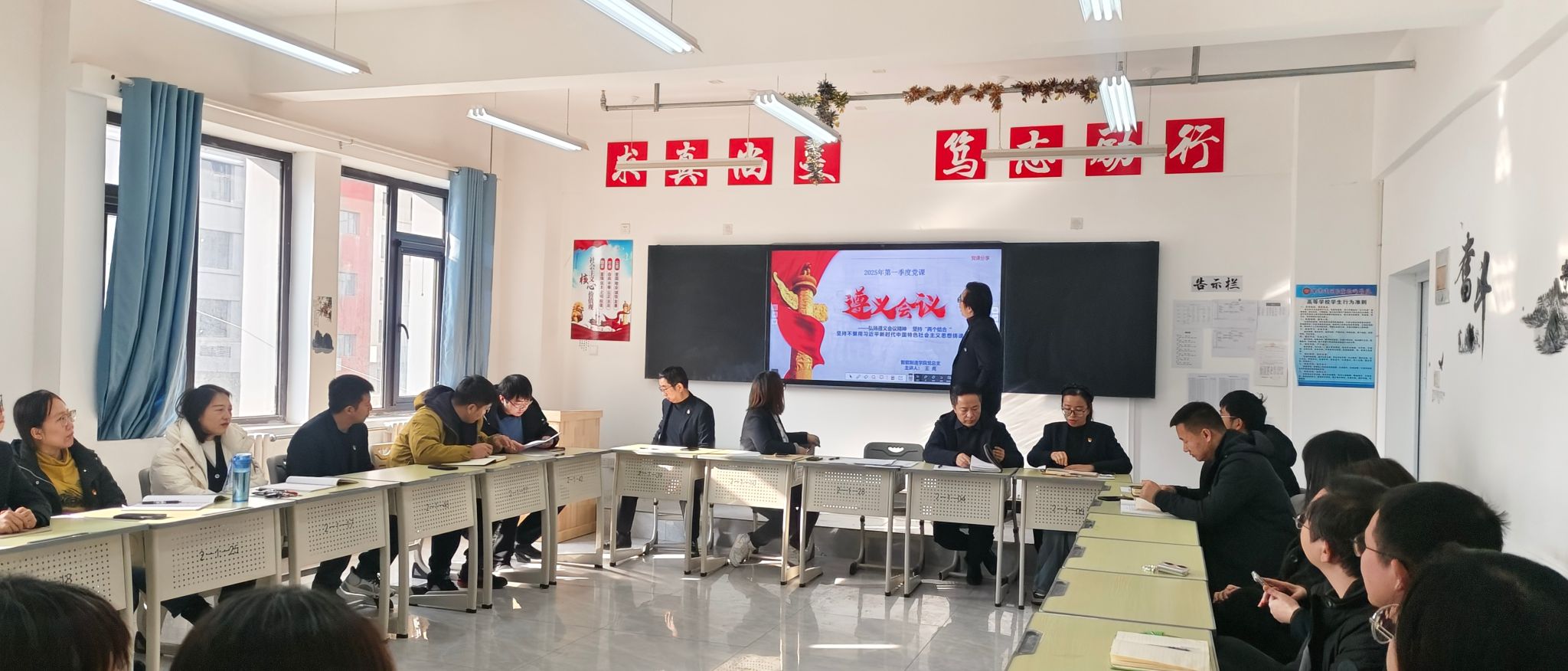 为纪念遵义会议召开90周年,弘扬遵义会议精神,智能制造学院党总支组织全体党员开展2025年第一季度党课学习,由王亮同志主讲,题目为《弘扬遵义会议精神,坚持‘两个结合’,坚持不懈用习近平新时代中国特色社会主义思想铸魂育人》王亮首先深入阐述了遵义会议精神的内涵,指出遵义会议精神实质是求索精神,内涵主要包括坚定信念、实事求是、独立自主、民主团结。强调遵义会议是我们党历史上一次具有伟大转折意义的重要会议,为中国革命的胜利指明了方向。