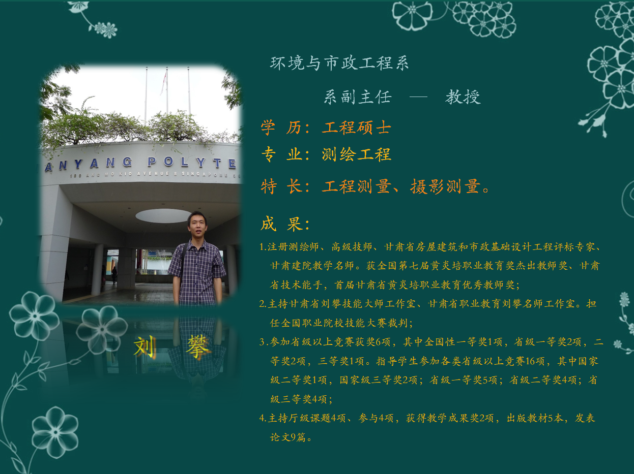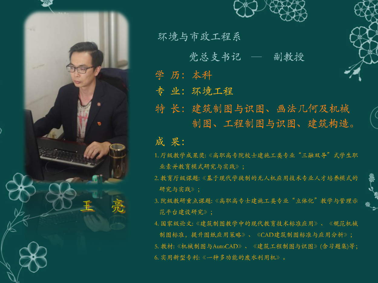 王亮,中共党员,副教授,双师素质教师。获得国家心理咨询师二级、BIM建筑模型设计师资格证书。获得《高职高专院校土建施工类专业“三融双导”式学生职业素养教育模式研究与实践》 甘肃省教育厅教学成果奖;参与《基于现代学徒制的无人机应用技术专业人才培养模式的研究与实践》、《高职高专土建施工类专业“立体化”教学与管理示范平台建设研究》、《BIM技术在工程造价专业人才培养中的应用研究》课题研究。获得国家实用新型专利《一种建筑工程施工浇筑模板》、《一种多功能的废水利用机》、《建筑夹心墙板拉结件》;发表论文《CAD建筑制图标准与应用分析》、《工业化住宅建筑构造技术体系探讨》、《规范机械制图标准,提升图纸应用策略》、《建筑构造技术的玻璃幕墙节能策略分析》、《建筑制图教学中的现代教育技术标准应用》;出版教材《建筑工程制图与识图》(含习题集)、《机械制图与AutoCAD》。参与甘肃省优质高等职业院校建设工程测量技术优质特色专业教改。